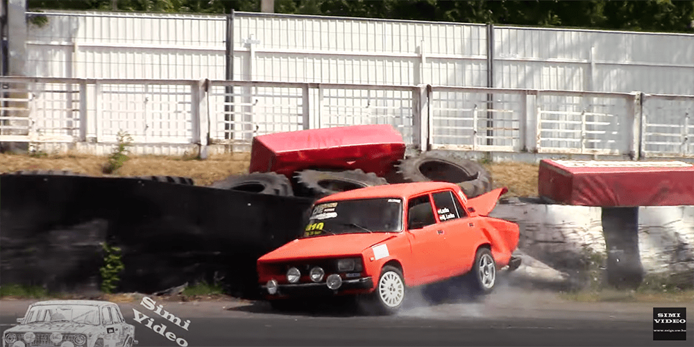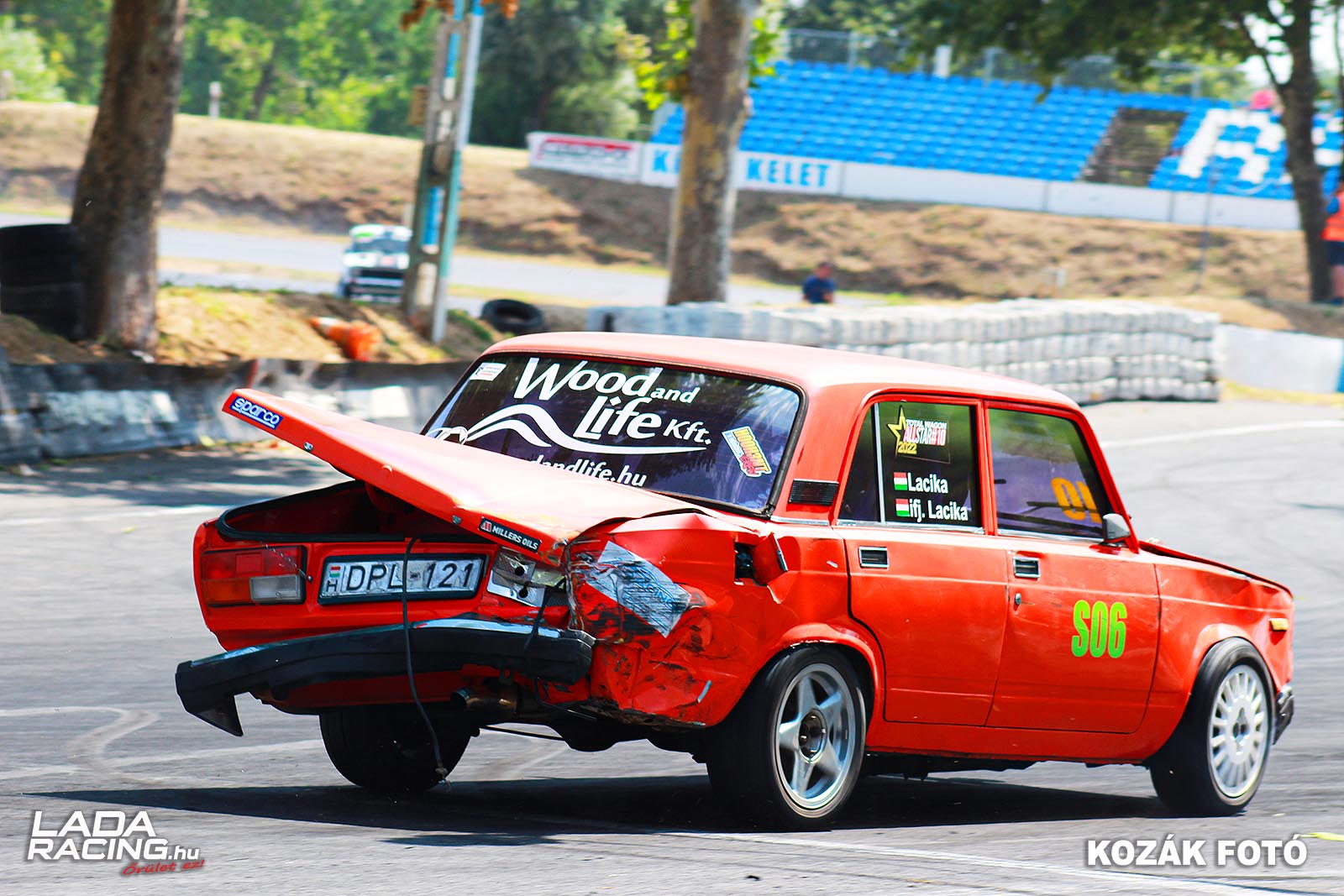 Így érkeztünk el a hétvégi versenyre, ahol szokás szerint Show kategóriában állt rajthoz és füstölte le a gumikat egészen addig míg a nagy egyenes utáni nyújtott balosban valami nagyon félrement mert nagyon nagy tempóval sodródott a külső ívre a narancs kocka és akkora erővel csapódott bele a falba a Lada, hogy amellett hogy még az akkumulátor is kirepült a csomagtartóból, a gumifalat is rendesen kibontotta a DPL minuszolva egy ott pihengető macska egy életét a 9-ből. Szerencsére senki nem sérült meg az eset során!